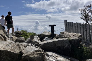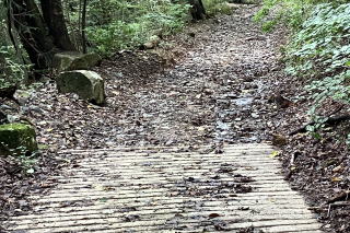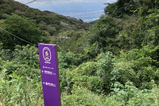 下山は深峰歩道を使った。この道は麓から御幸ヶ原までの工事用重機が通る狭い林道。数年前から舗装路工事が続いている。 御幸ヶ原のタイル舗装やトイレの改修のための工事車両が使う道となっている。 |