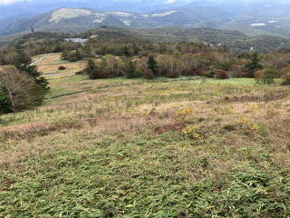 ![]() 12:44 レストハウス前から見た丸山1689m 小丸山1601mは随分低く見える 昼食後大山コースに向かう ここから先はササの生い茂った難路となる |