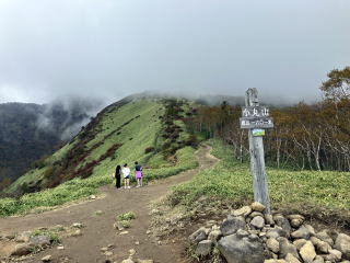![]() 10:28 小丸山山頂 観光客はここまで 前方の霧の先は赤薙山 |