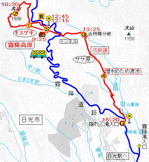 | 日光の霧降高原に行く。もともとニッコウキスゲを見るために7月に計画したのだが雨で中止。今回紅葉狩りということで再度霧降高原へ。 本コースは2016年6月に今回と同じコースを歩いている。 北千住6時11分発南栗橋行き急行に乗車、南栗橋で東武日光行き急行に乗換え日光着8時18分。バスは9時丁度。不便だがこれしかない。駅前には大勢の観光客がいるが皆さん東照宮方面に行人くばかり。 |